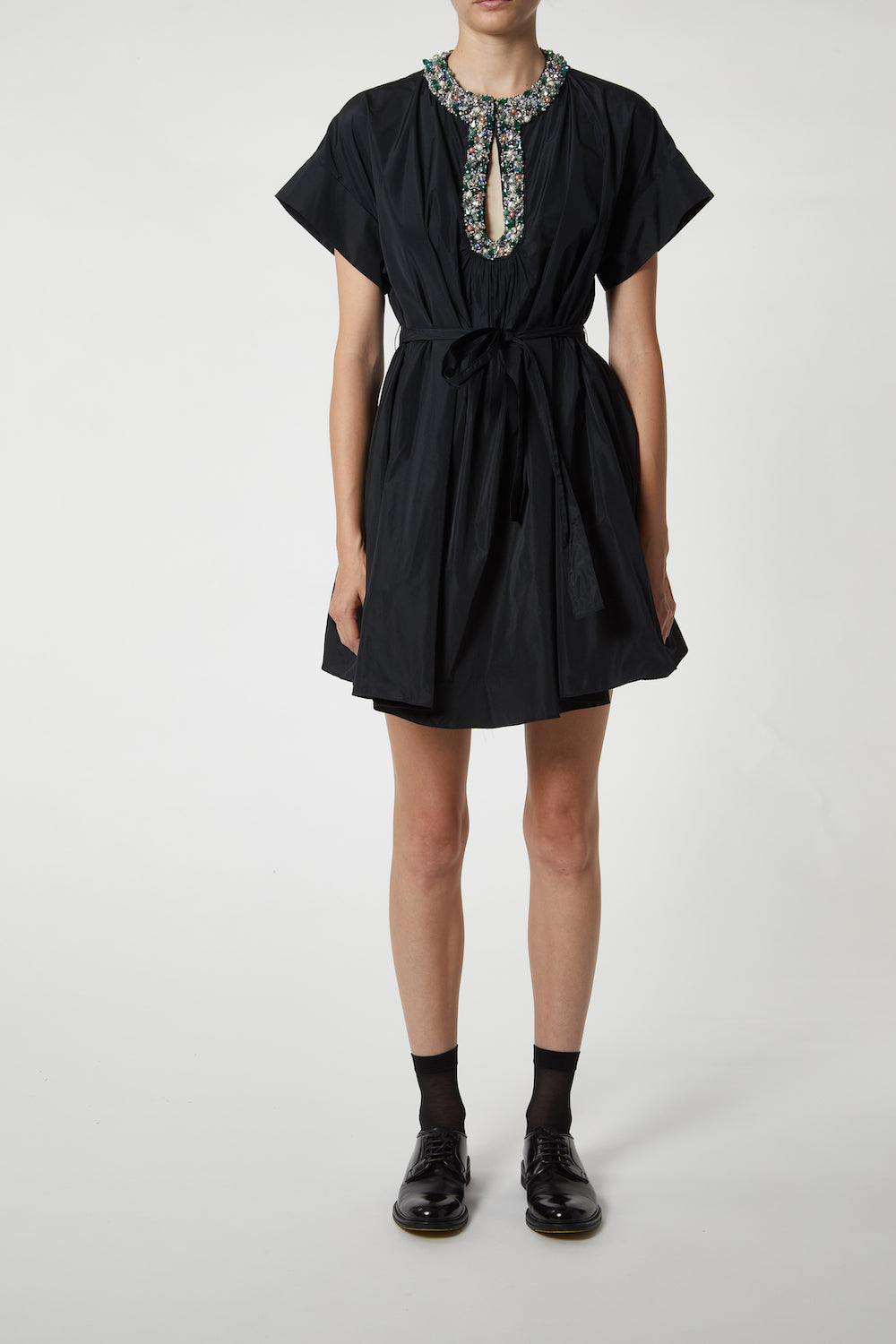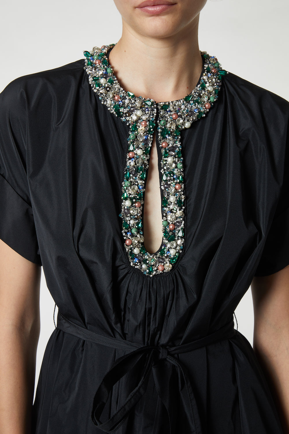 Diana Taffeta Mini Dress with Beaded Jewel Neckline, Black/Multi