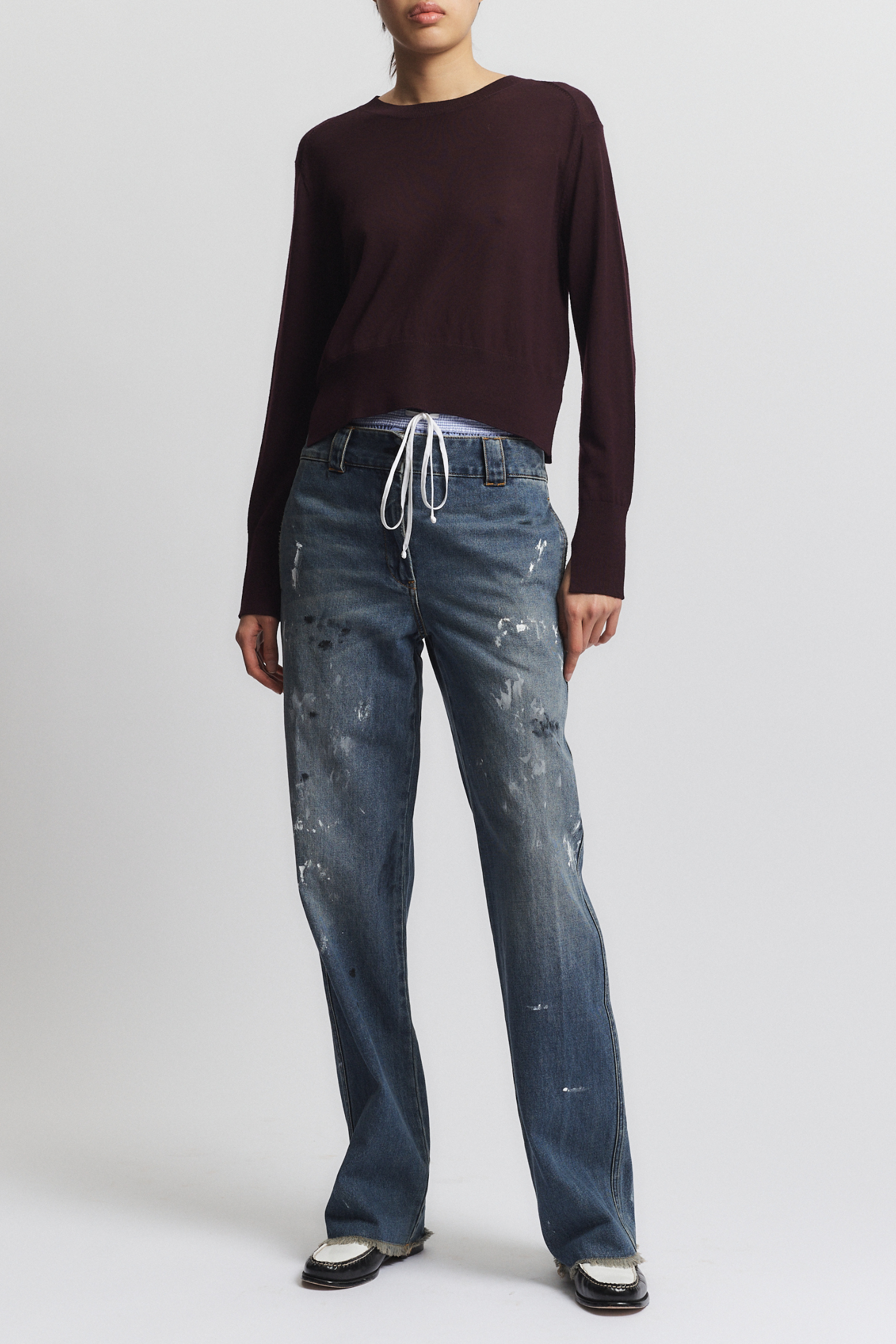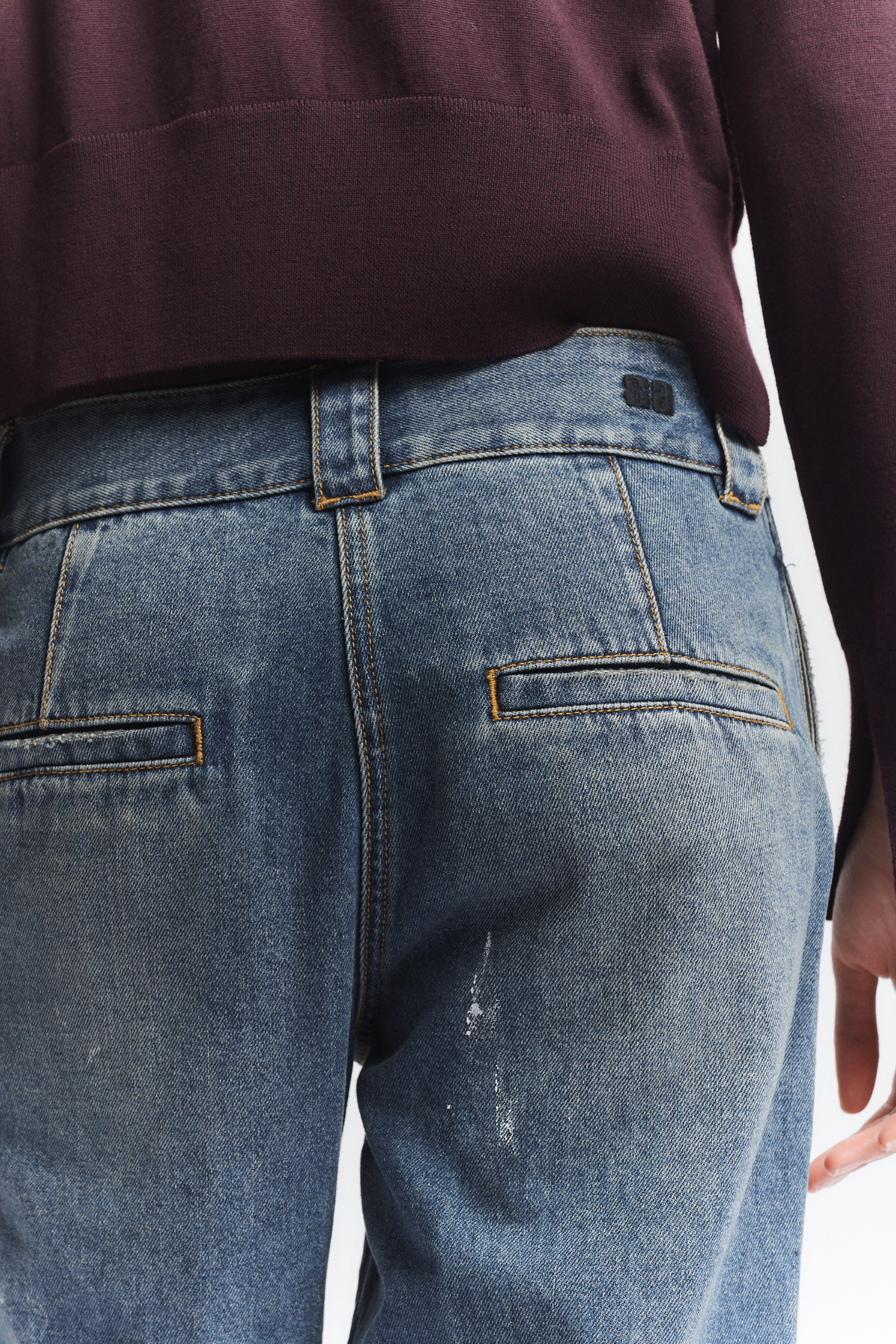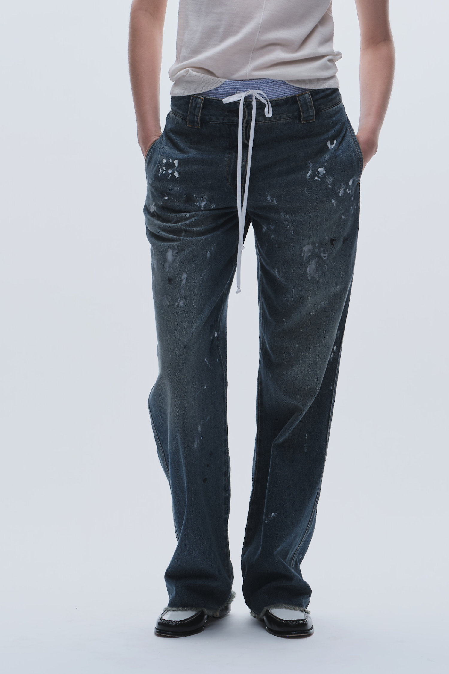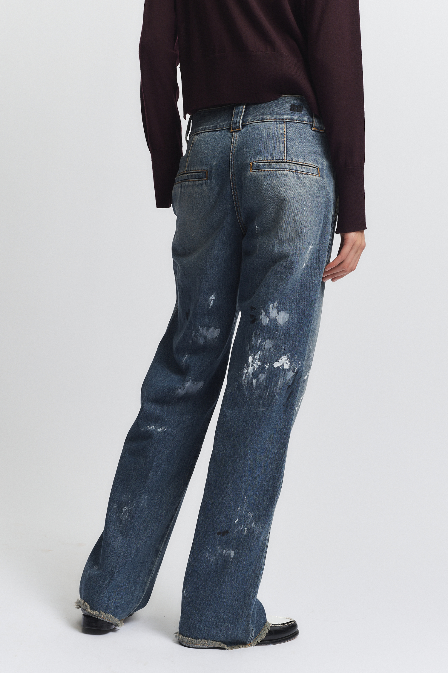 The Nessa Denim Pant in Painter Wash features a distinctive splatter paint design for a unique and worn-in appearance. Our cotton-tencel blend fabric provides unparalleled comfort and style, thanks to the addition of tencel, which is known for its softness and breathability. The fabric's luxurious texture is comparable to sweatpants, but with a refined trouser silhouette. These pants stand out with their carefully crafted design, deviating from the traditional five-pocket jean style to add sophisticated details and elevate your wardrobe.