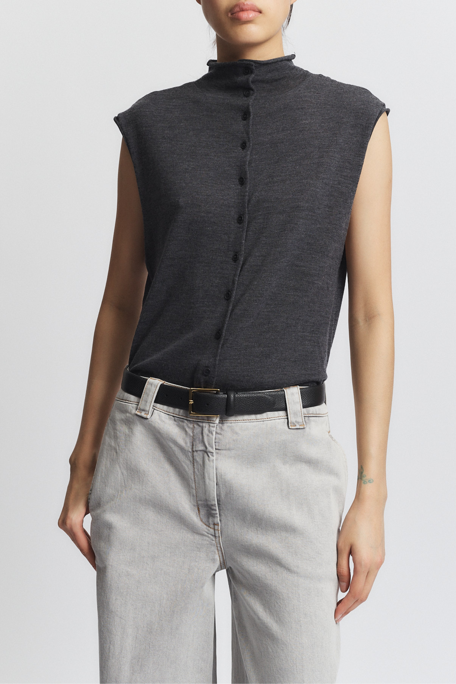 Introducing the Brooke Sleeveless Sweater, a versatile and elegant update to a classic cardigan. Made from 100% fine gauge merino wool, this seasonless piece is soft, lightweight, and features an elegant button detail that can be worn in the front or back for added style. Buttons can be done to make the shell look like a polo or opened to show the collar bone and neck. Complete the look by pairing it with the matching Ashley Cardigan sweater.