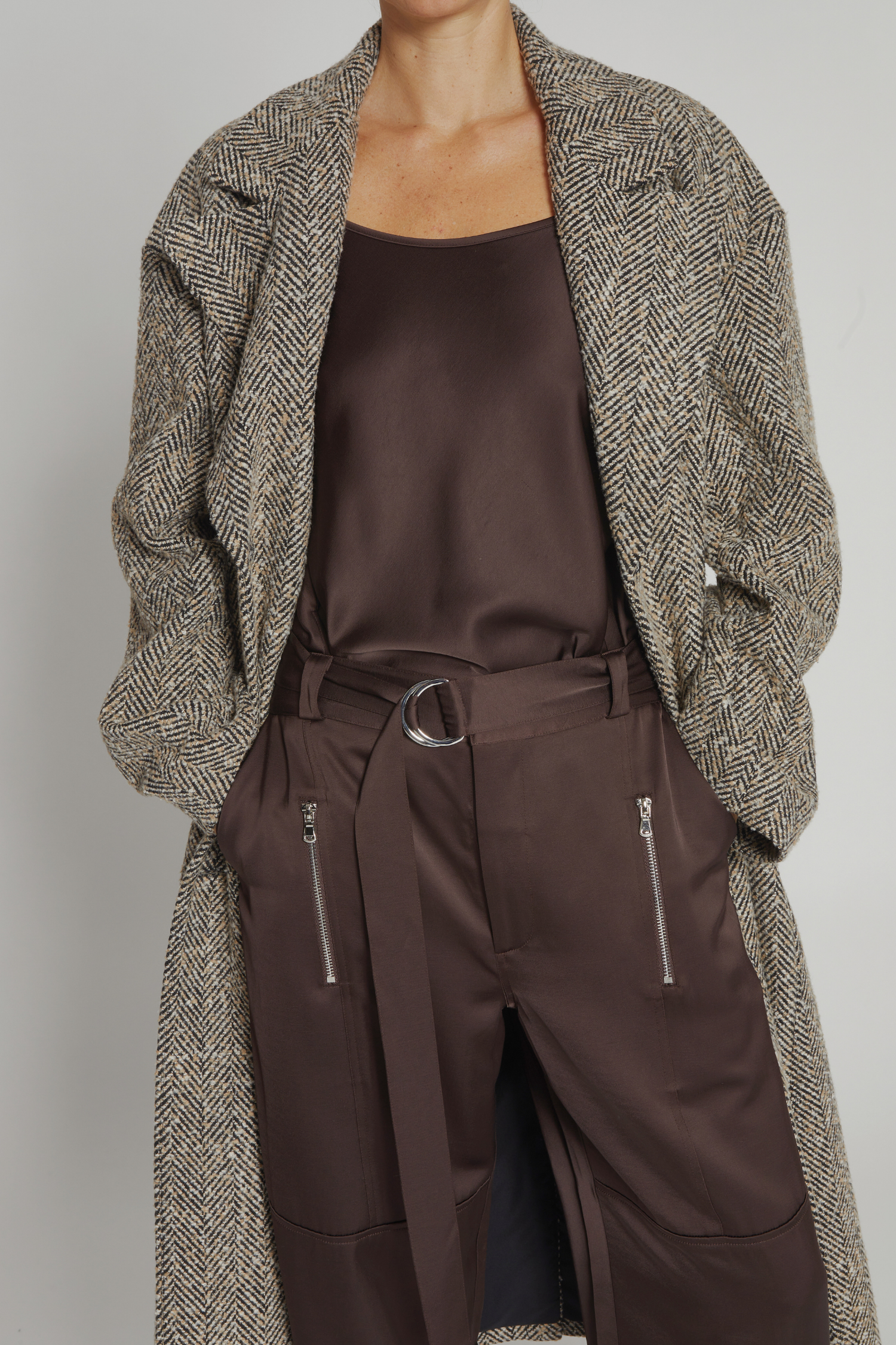 Expertly crafted from a wool blend, the Bronwyn Longline Coat in classic brown houndstooth print offers both warmth and style. Featuring a relaxed fit, horn buttons, two pockets, and a back slit for ease, this lined coat is the perfect addition to any fall or winter wardrobe.