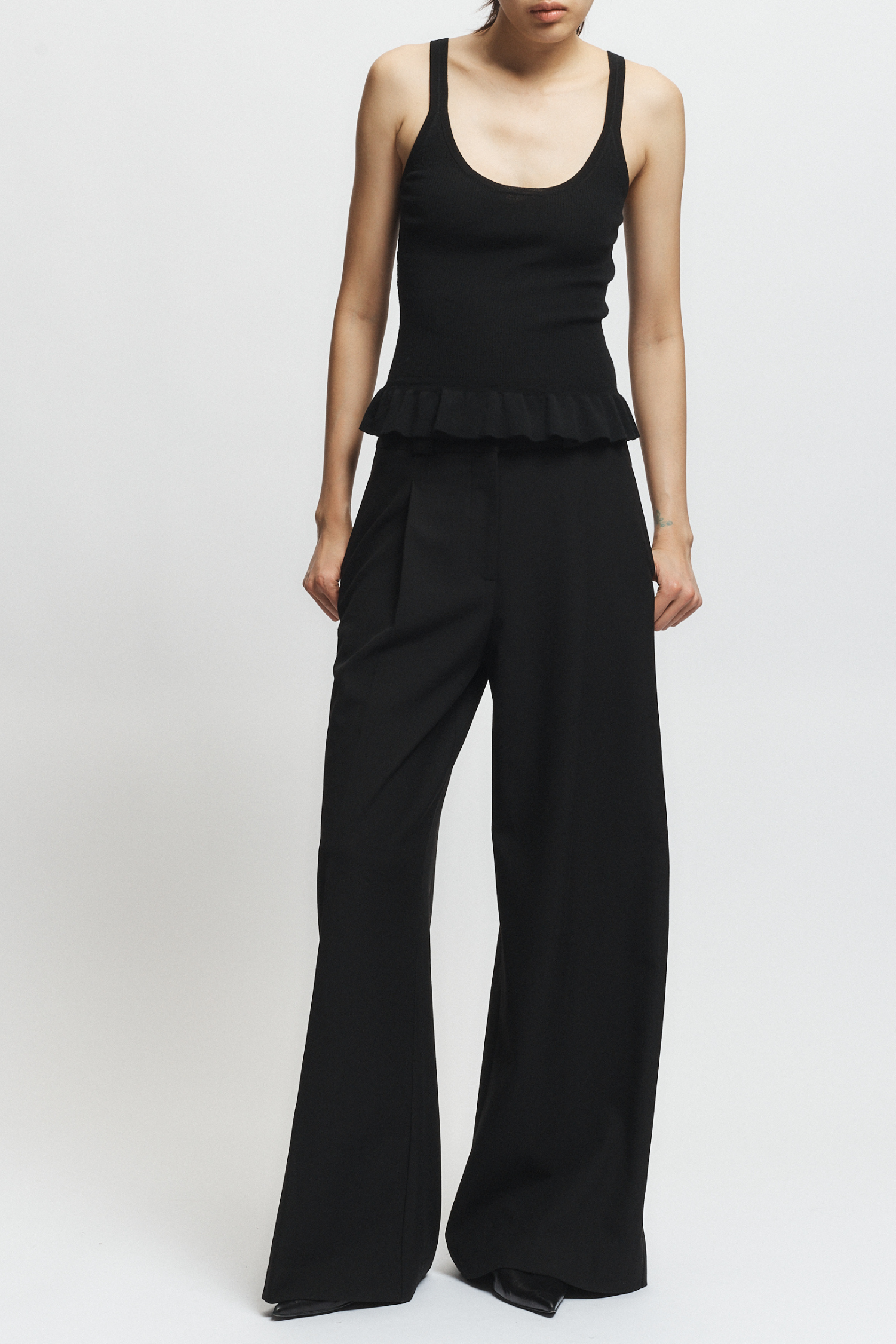 Crafted from 100% fine gauge merino wool, the Eden Ruffle Knit Tank in black offers a refined silhouette with its fitted design and elegant peplum hem. This versatile piece pairs seamlessly with the Tiffany trouser, creating a sophisticated ensemble ideal for both professional and upscale casual settings. The natural breathability and softness of merino wool ensure comfort throughout the day while maintaining a polished appearance.