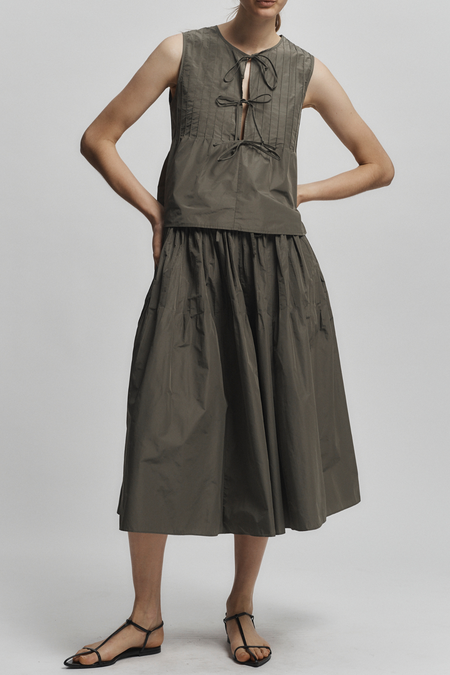 Expertly crafted from taffeta, the Eva Midi Skirt in olive green features waist ties and pintuck pleats for a stylish yet functional look. Perfect for any occasion, pair it with the Nina top for a complete outfit.