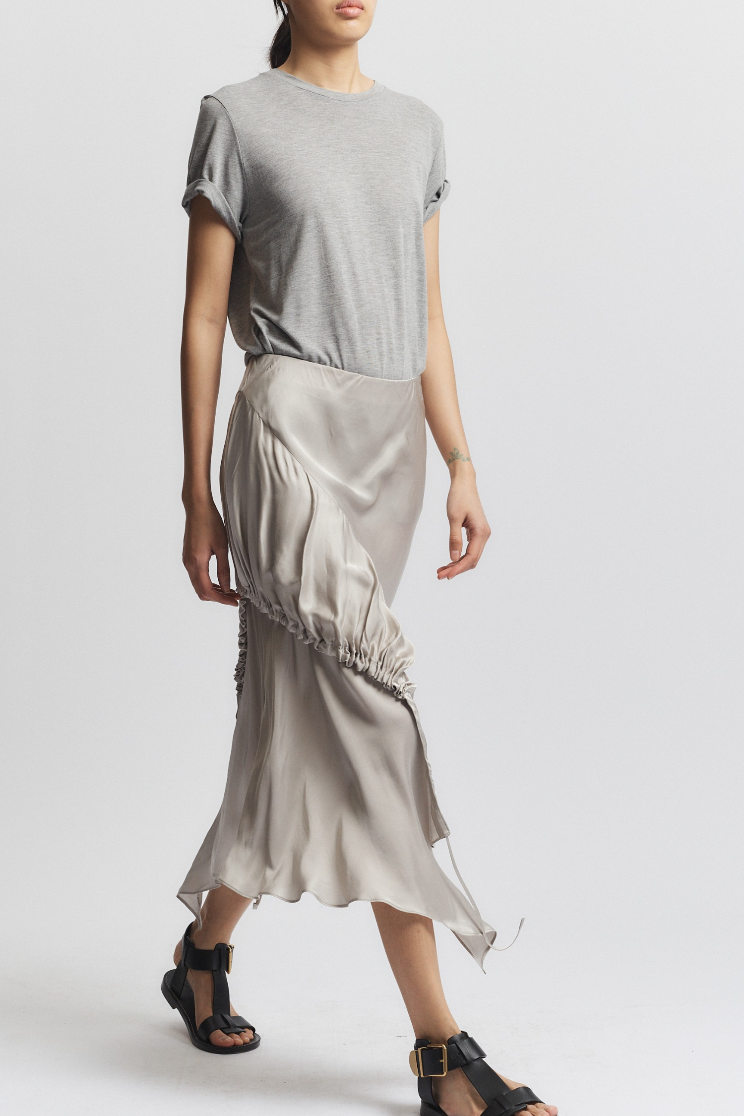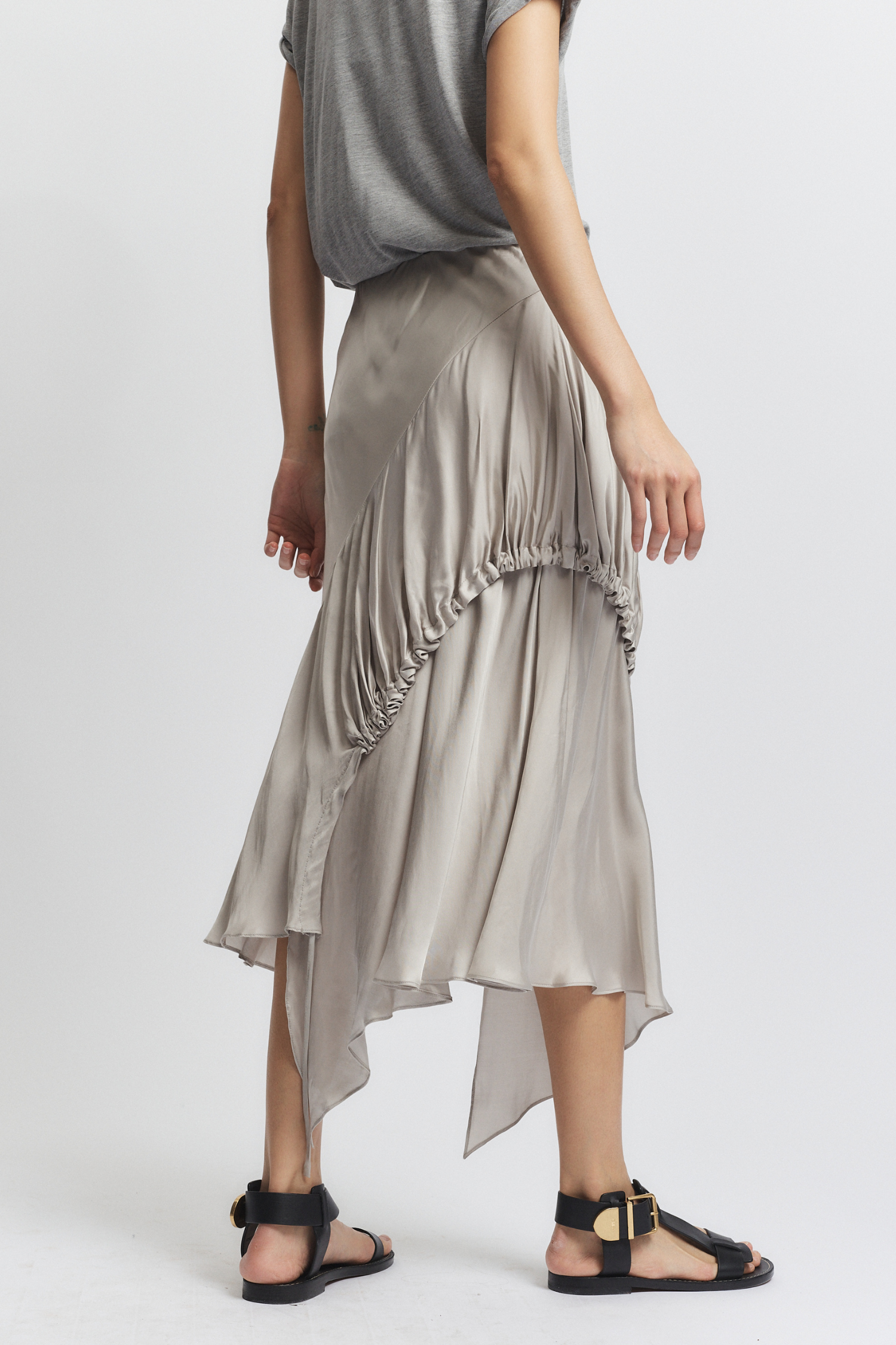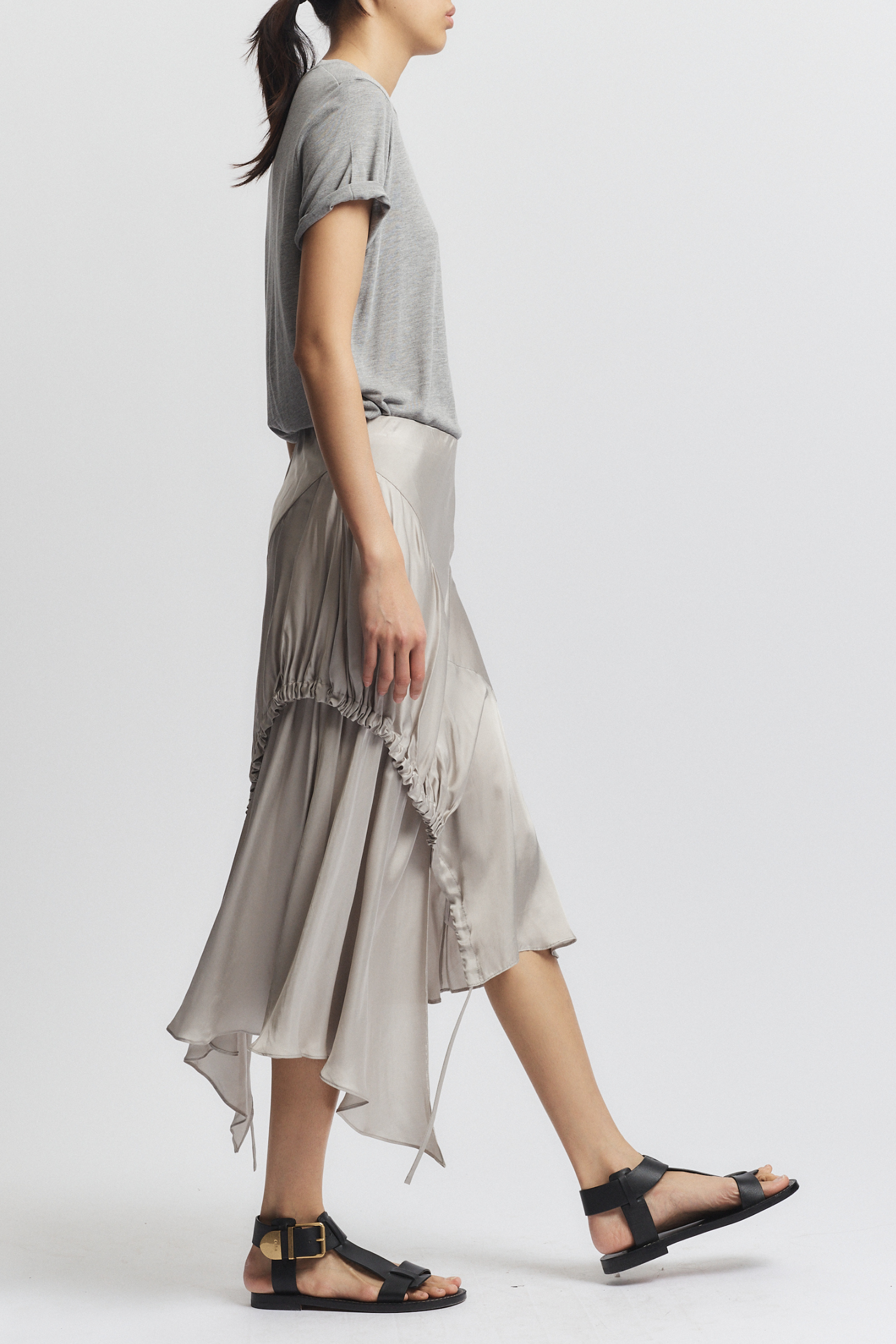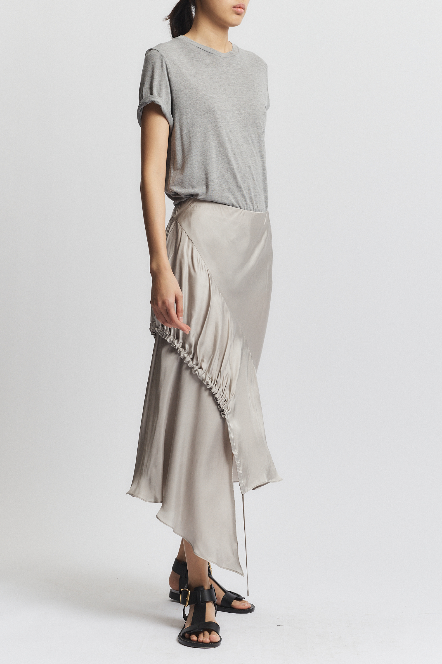 Effortlessly transition from day to night with the Kalani Asymmetric Skirt. This midi skirt features a viscose shine and draw string cord for adjustable style. The pull on waist provides comfort and convenience while the machine washable material makes it easy to care for. Perfect for pairing with a casual tee.