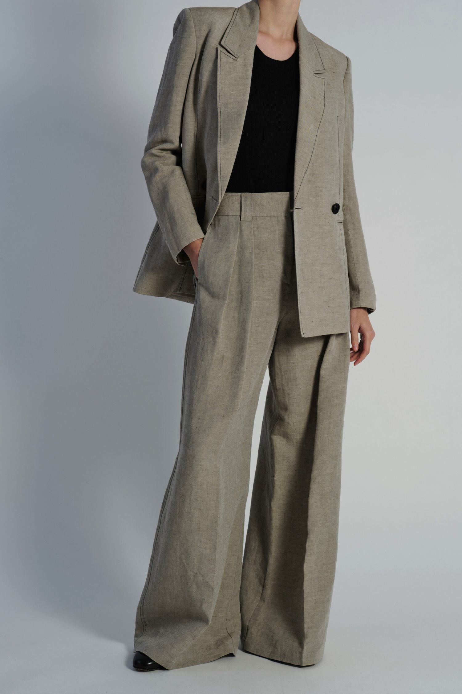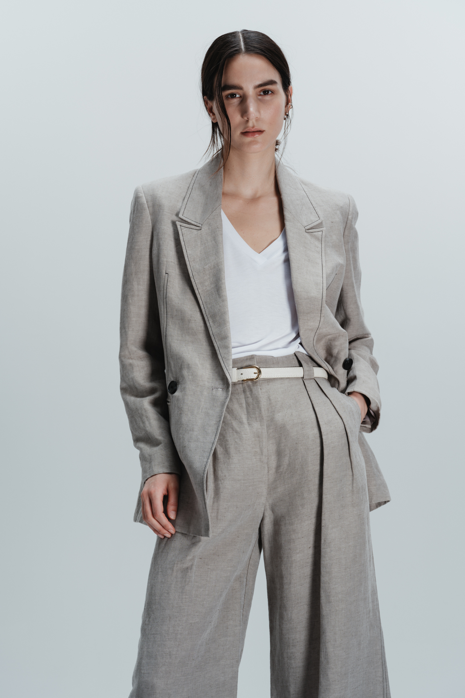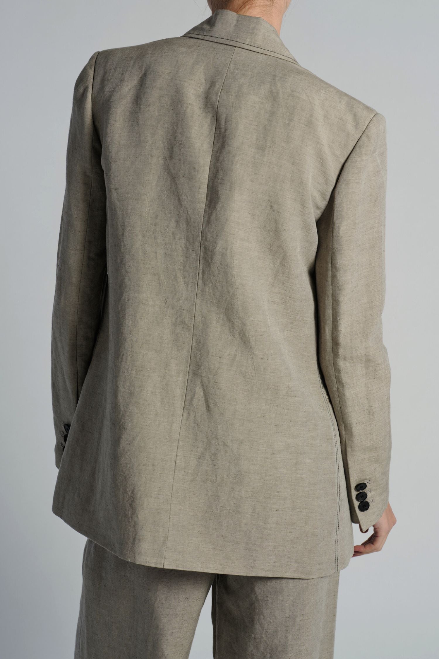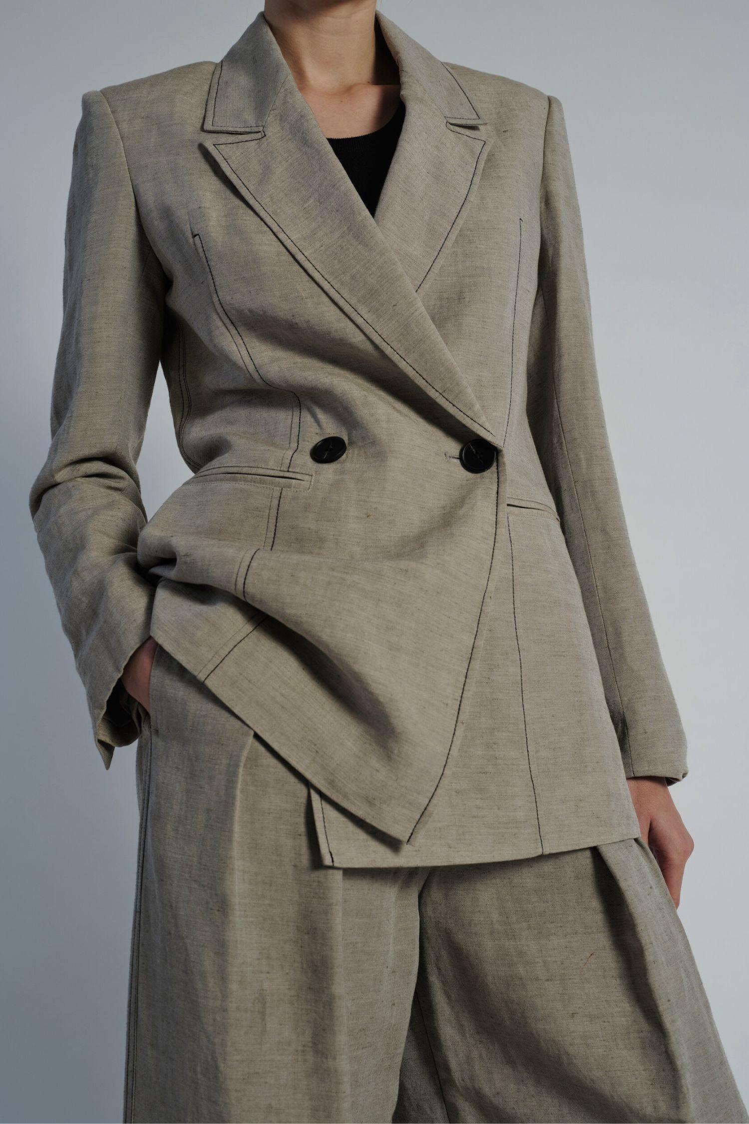 The Kara Jacket in Grey Linen offers effortless and easy style with its soft tailored design, accented by a double button front and black top stitch. Cut in a long line, this blazer is perfect for any occasion. Made with high-quality linen for a comfortable and polished look.