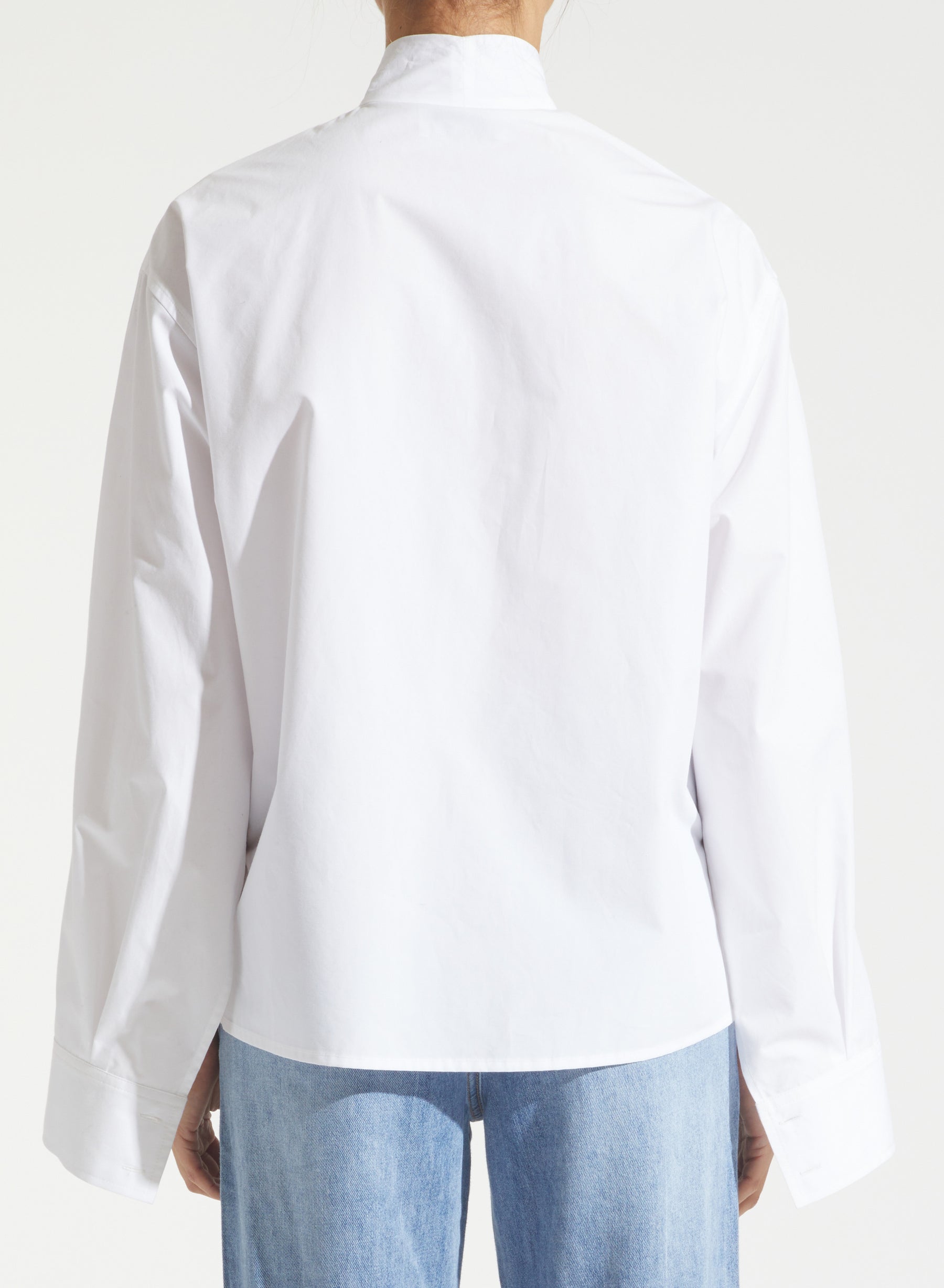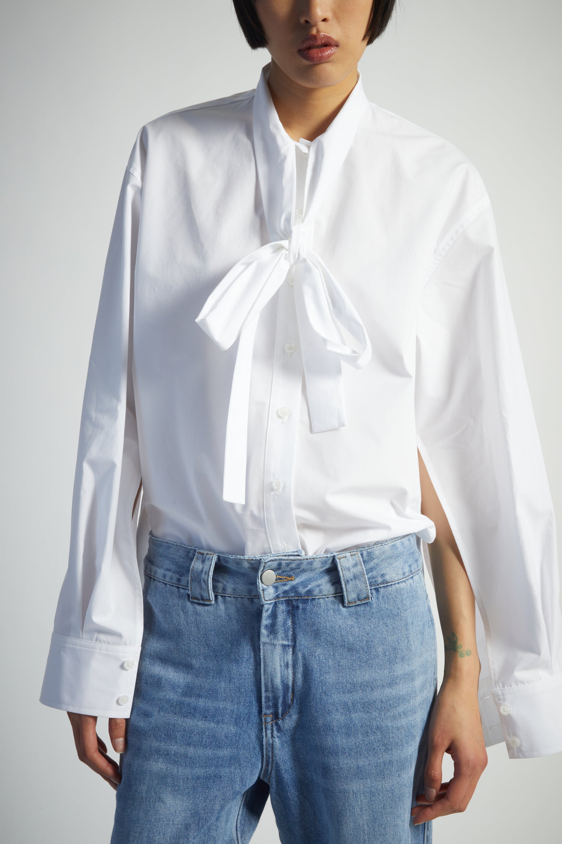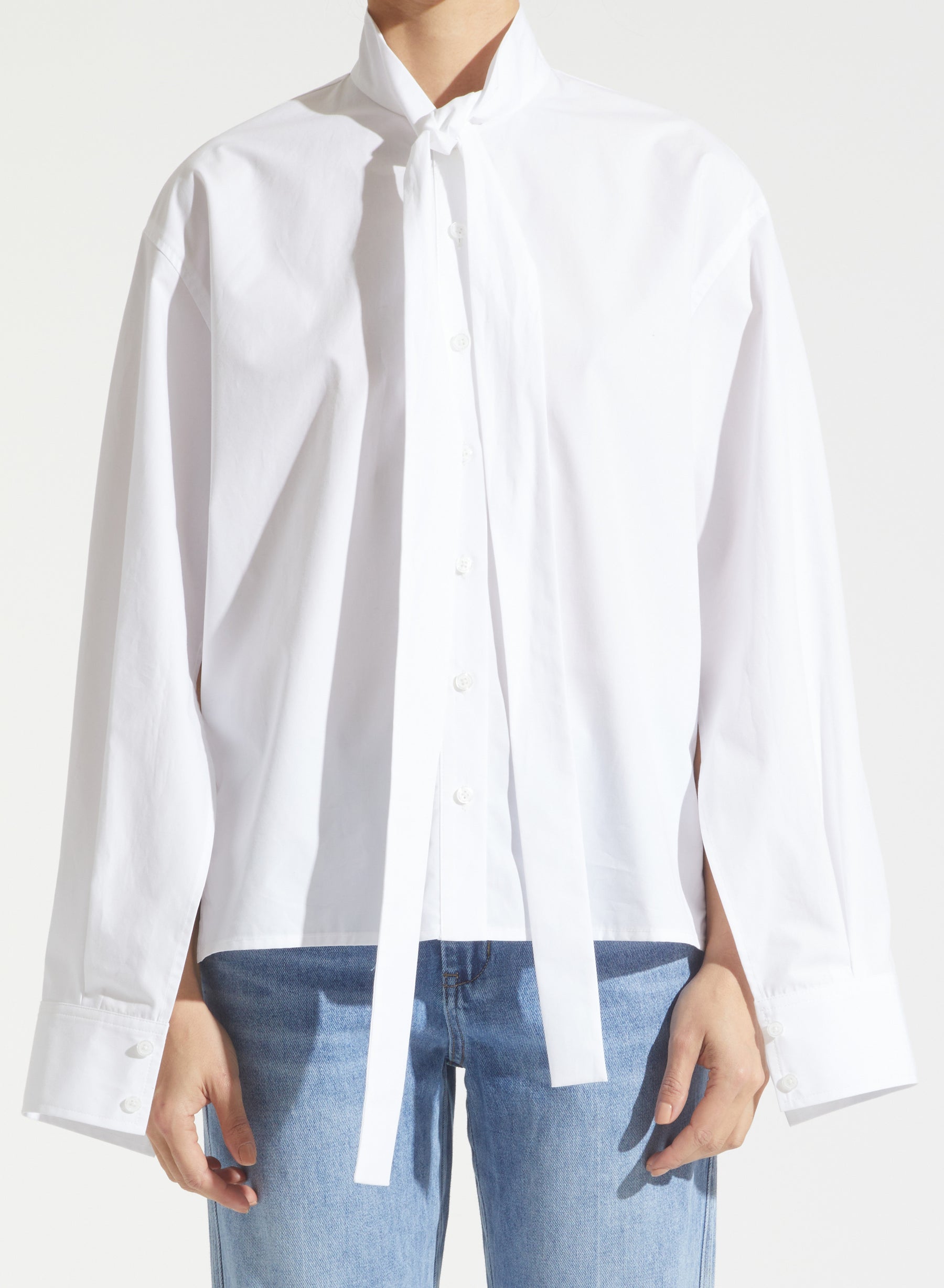 Elevate your wardrobe with our white poplin button-down with tie at neck and wide sleeves, and embrace the perfect balance between classic charm and contemporary style. Upgrade your fashion game with this must-have piece that effortlessly transitions from day to night.