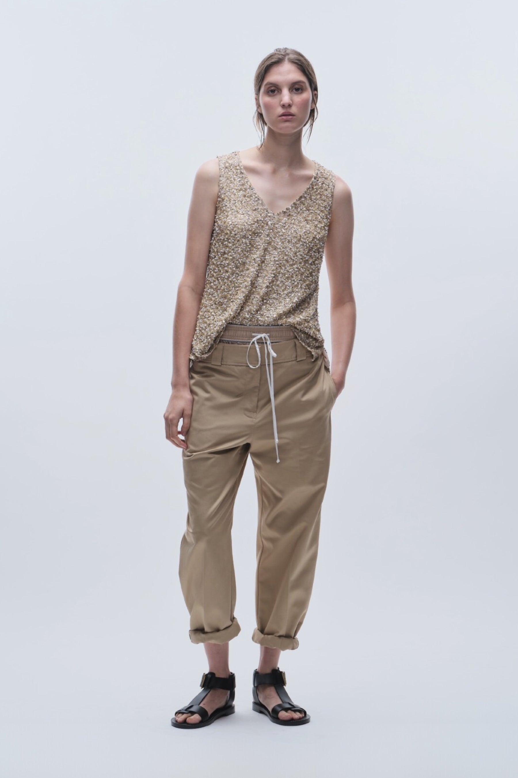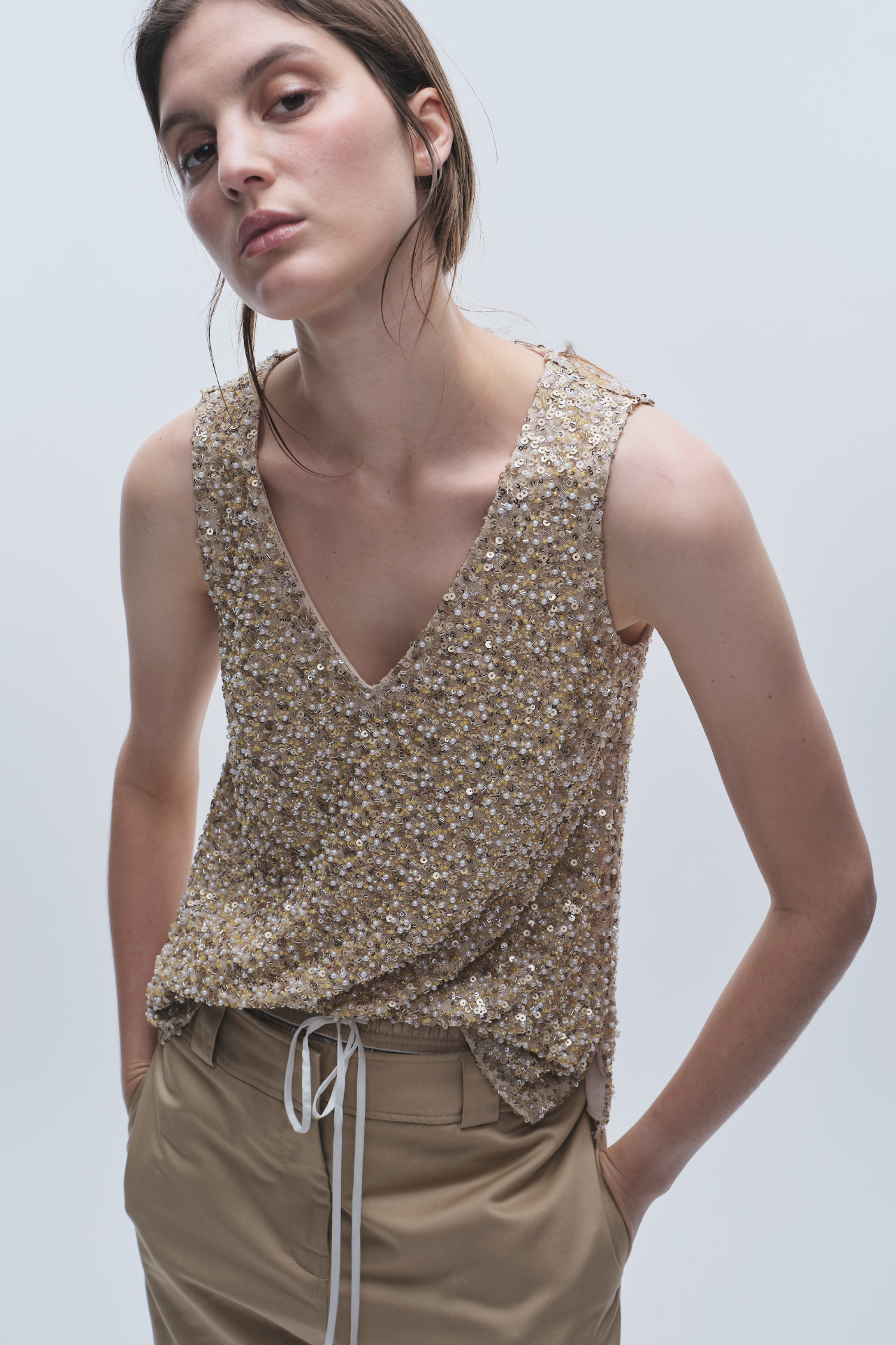 Elevate your wardrobe with the Kinley Beaded Top in Gold. This sophisticated and versatile top features intricate beading and a flattering silhouette. Perfect for any occasion, dress it up with a skirt or down with jeans. Experience luxury and style with this must-have piece.