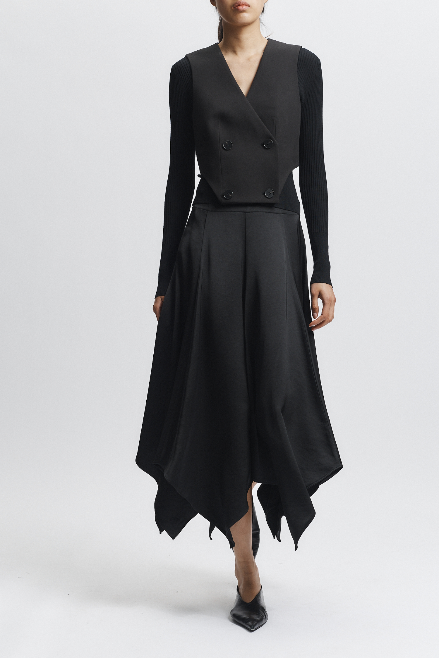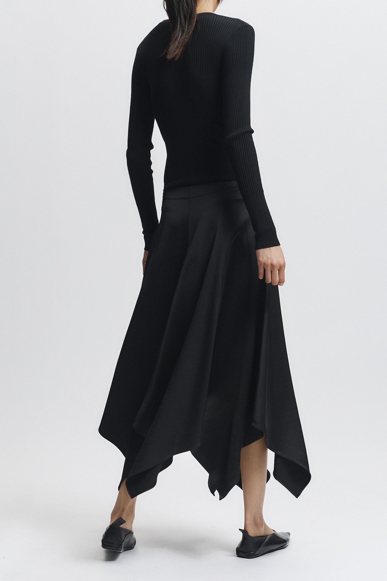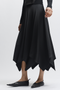 This Landon Panel Skirt in black is crafted from luxurious charmeuse fabric, offering a smooth, glossy finish that drapes elegantly. Its flowy silhouette enhances movement and provides a refined, sophisticated look suitable for both day and evening wear. The skirt’s panel construction ensures a flattering fit that complements various body shapes with expert tailoring.