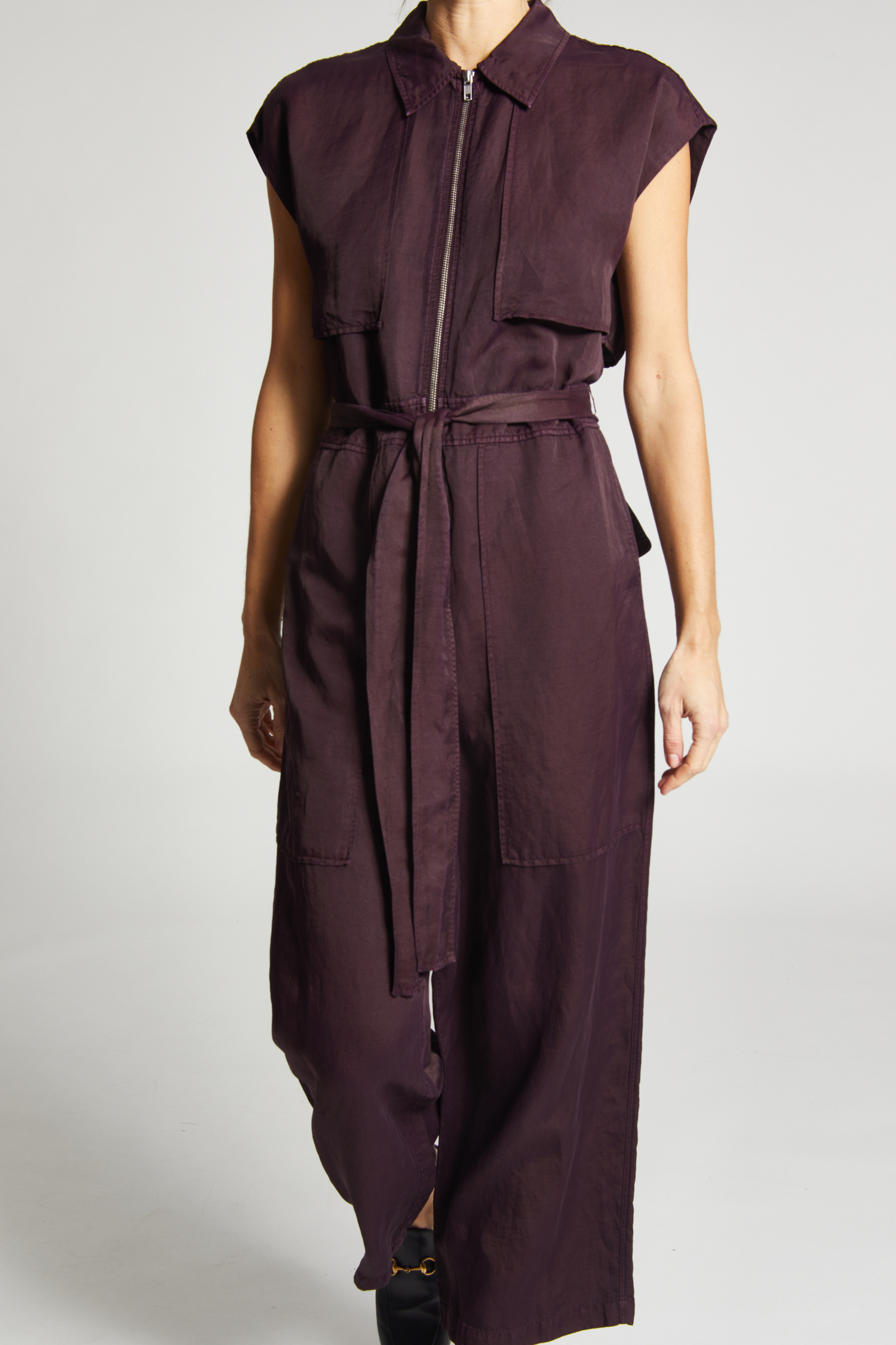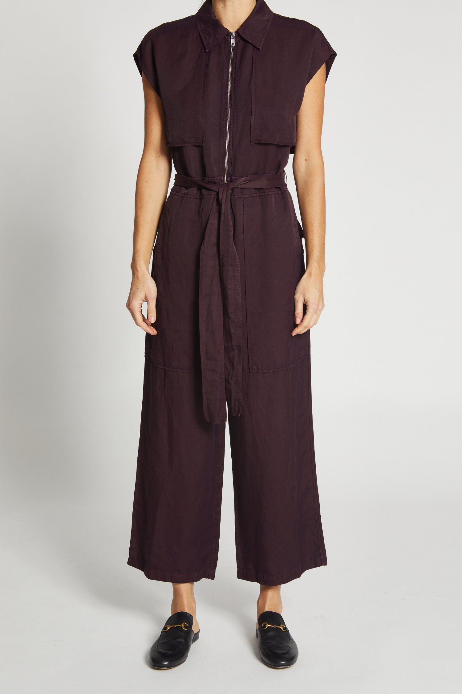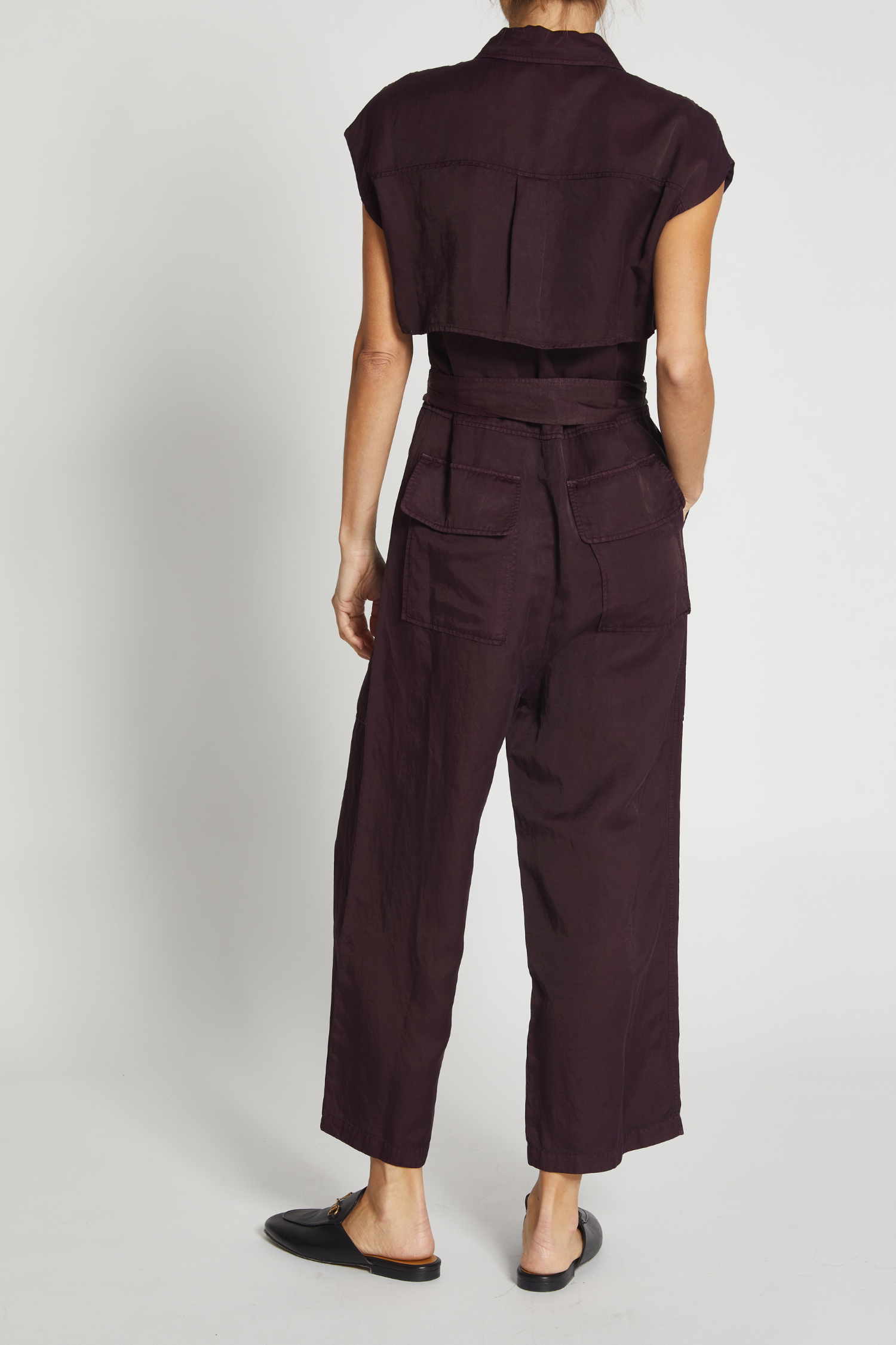 The Maxine Short Sleeve Cargo Jumpsuit in Fig is a versatile and stylish addition to your wardrobe. Made with a super soft blend of cotton and Tencel, this jumpsuit features a garment dye wash that creates a beautiful tone of dark burgundy. The exposed zipper front and utility details with pockets add a touch of functional charm. Complete with a removable tie at the waist, this jumpsuit is perfect for effortless and comfortable everyday wear.