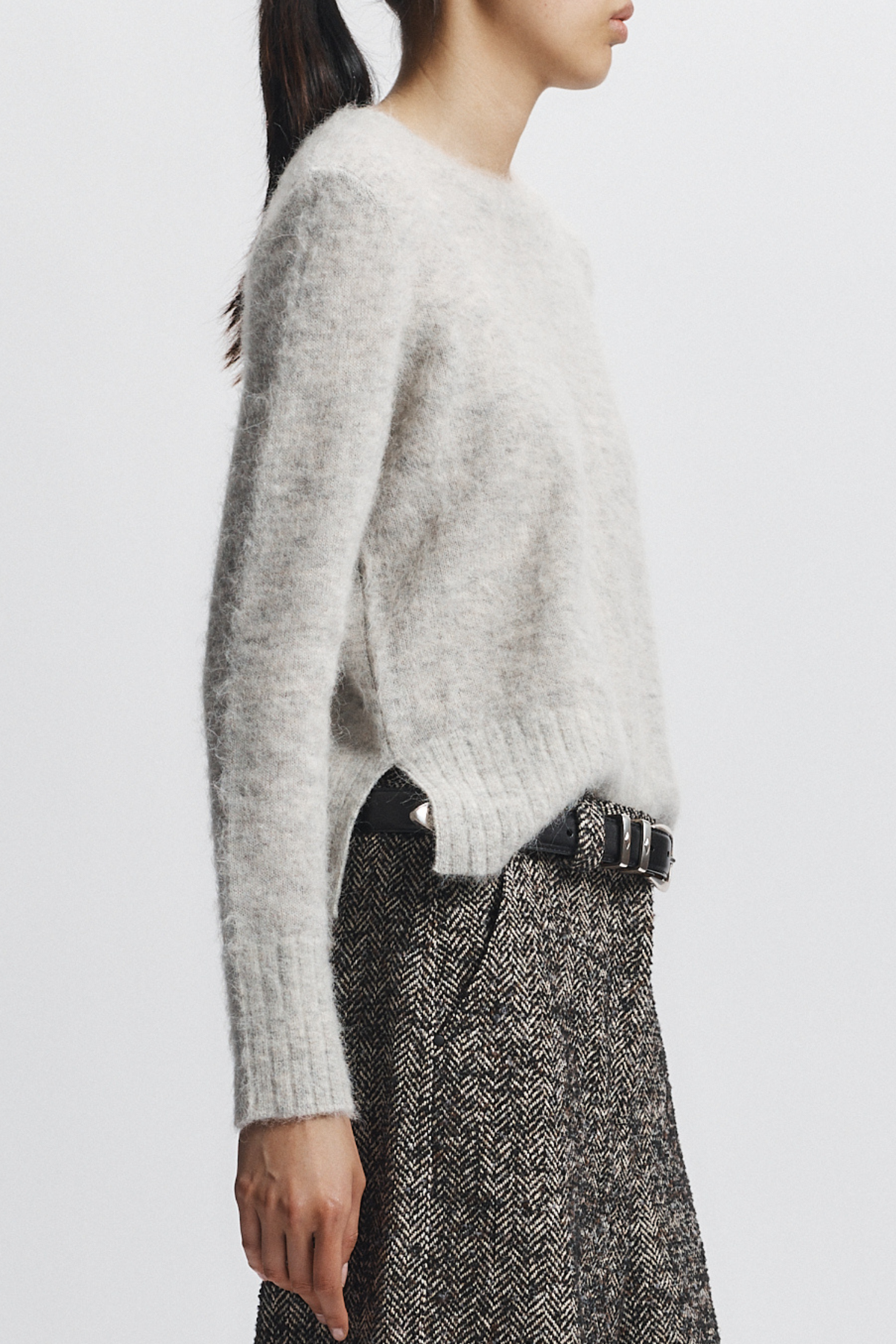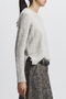 The Raylan Crewneck Fur Sweater in Pale Grey Heather features a soft wool and alpaca blend that offers both warmth and refined comfort. Its subtle grey tone pairs effortlessly with the Otto boucle pant, creating a sophisticated ensemble perfect for cooler days. This combination balances tactile richness with tailored style, ideal for those seeking expert-level layering with understated elegance.